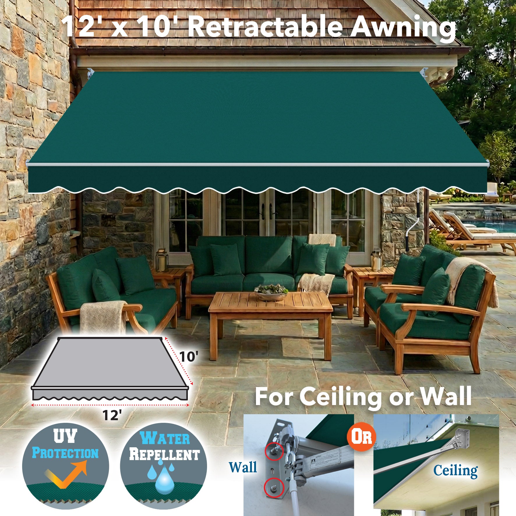 Need more coverage? The 12' x 10' model features an extra-deep projection, providing 120 sq. ft. of cooling shade. Perfect for deep porches and large outdoor lounge areas.